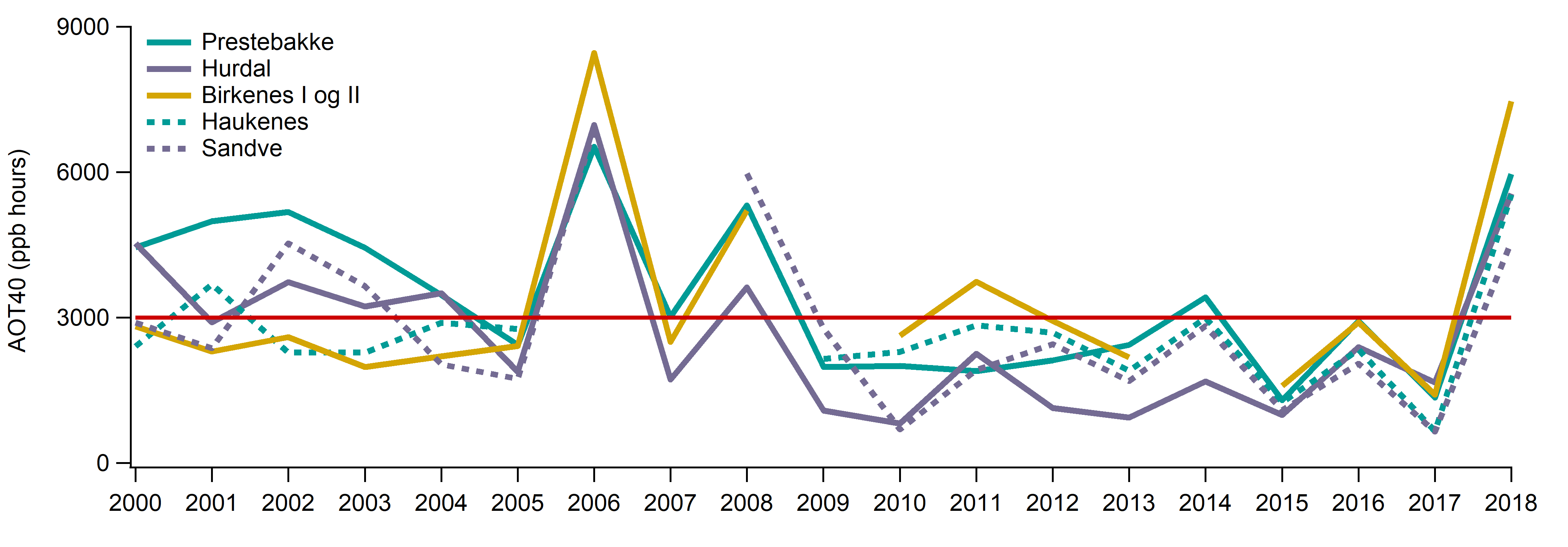 Langtidsmålet for beskyttelse av plantevekster ble for eksempel overskredet på fem stasjoner i Sør-Norge i 2018. En så omfattende overskridelse har ikke forekommet i Norge på over 10 år. I tillegg ble grenseverdien for skog overskredet på 6 av de 8 stasjonene der bakkenært ozon overvåkes.