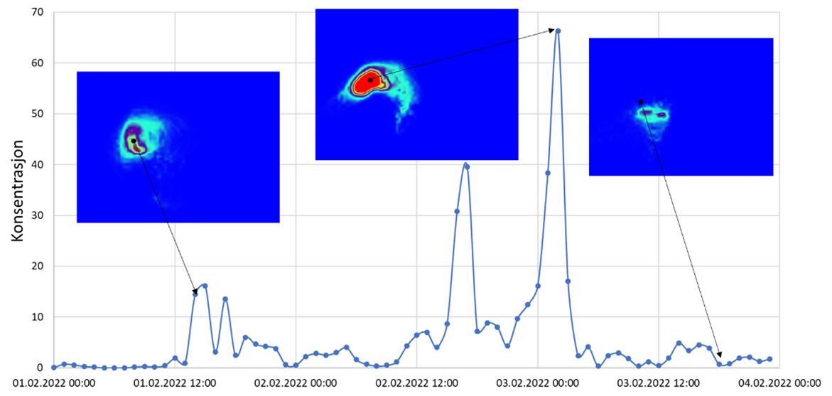 Figuren under viser tre øyeblikksbilder av konsentrasjonsfeltet for PM10 sammen med tidsvariasjonen på et gitt punkt over en periode i februar. Det er beregnet for et helt kalenderår som gir årsmiddel-, døgnmiddel- og timesmiddelkonsentrasjoner.